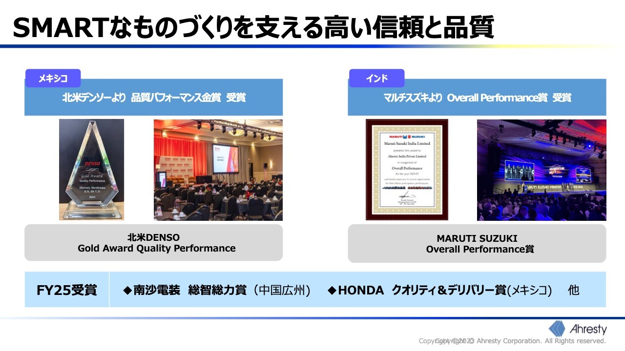 「SMARTなものづくり」を実現するにあたり、基盤となるのは品質であることに変わりはありません。今年度も複数のお客さまより、QCD(品質・コスト・納期)に関する各種の賞をいただきました。「SMARTなものづくり」の実現を通じて、さらなる顧客満足度の向上を目指していきます。