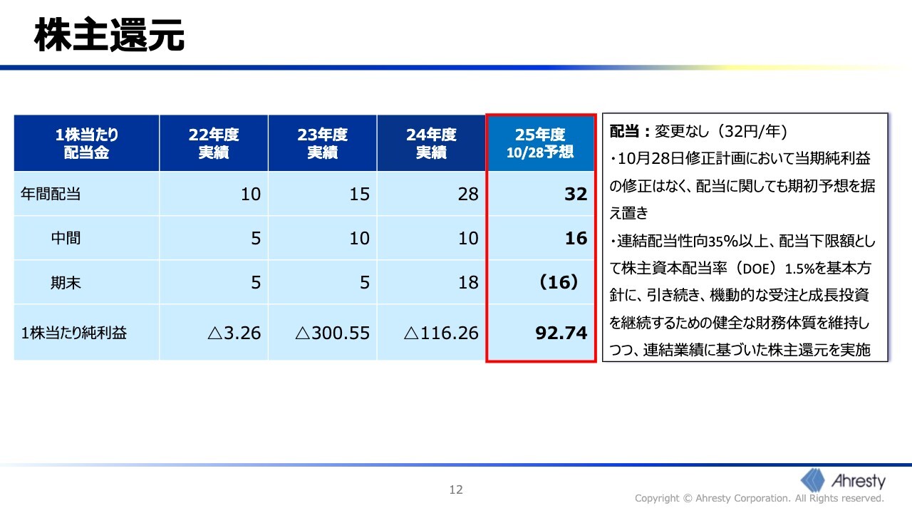 株主還元についてです。配当は、年間32円の予想から変更はありません。株主資本配当率(DOE)は1.5パーセントを配当下限額とし、連結配当性向は35パーセント以上を維持することを基本方針としています。