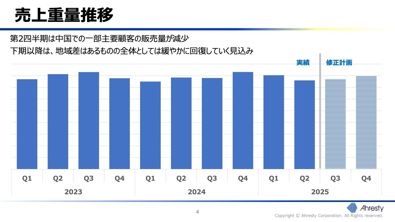 下期以降も地域差はあるものの、全体として回復を見込んでいます。米国関税の影響や中国の景気状況を考慮した販売重量の予測については、おおむね計画どおりの水準を維持しており、今後も緩やかな仕事量の増加を想定しています。