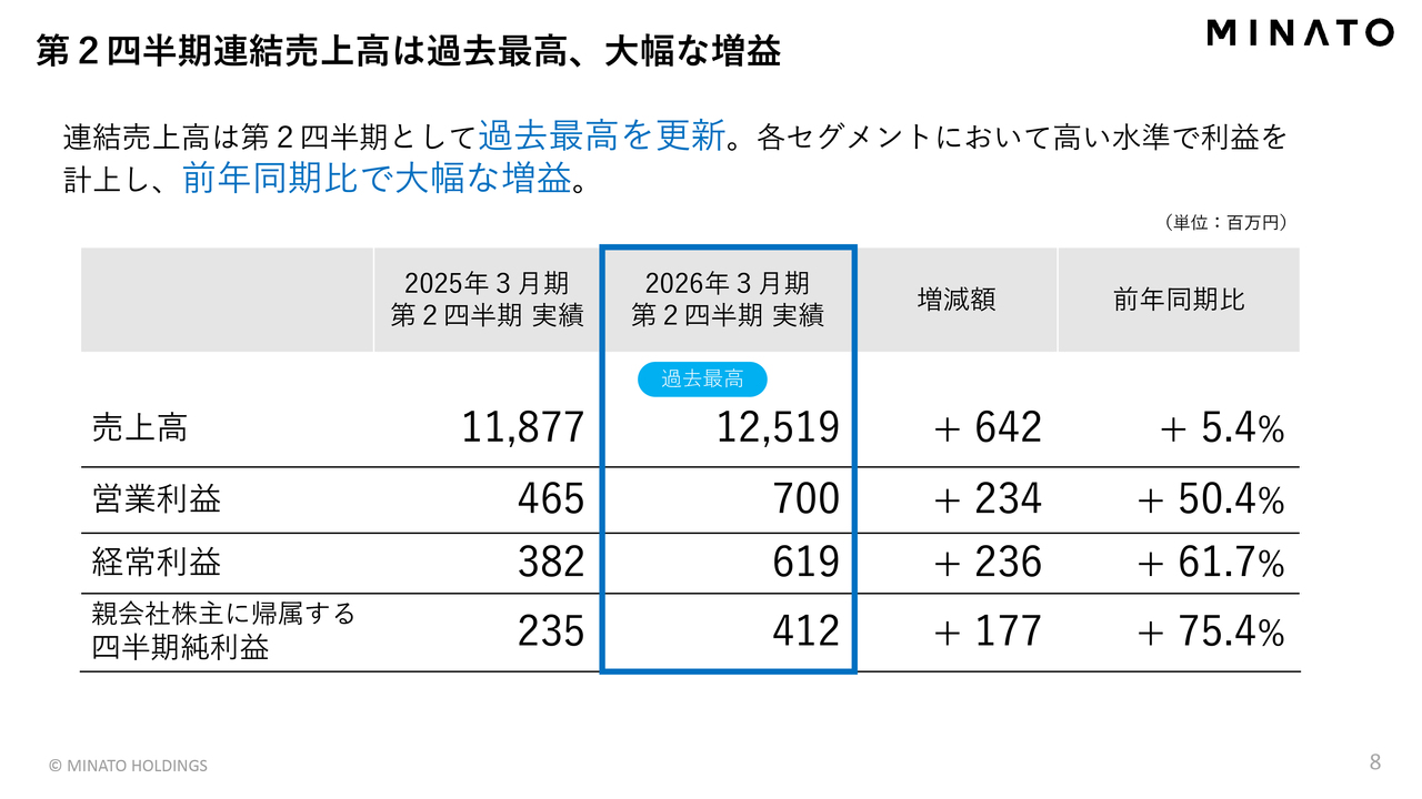 まず、2026年3月期第2四半期決算のハイライトです。ミナトホールディングスの第2四半期として、過去最高の連結売上高を計上しました。また、利益率の向上により大幅な増益を達成しています。