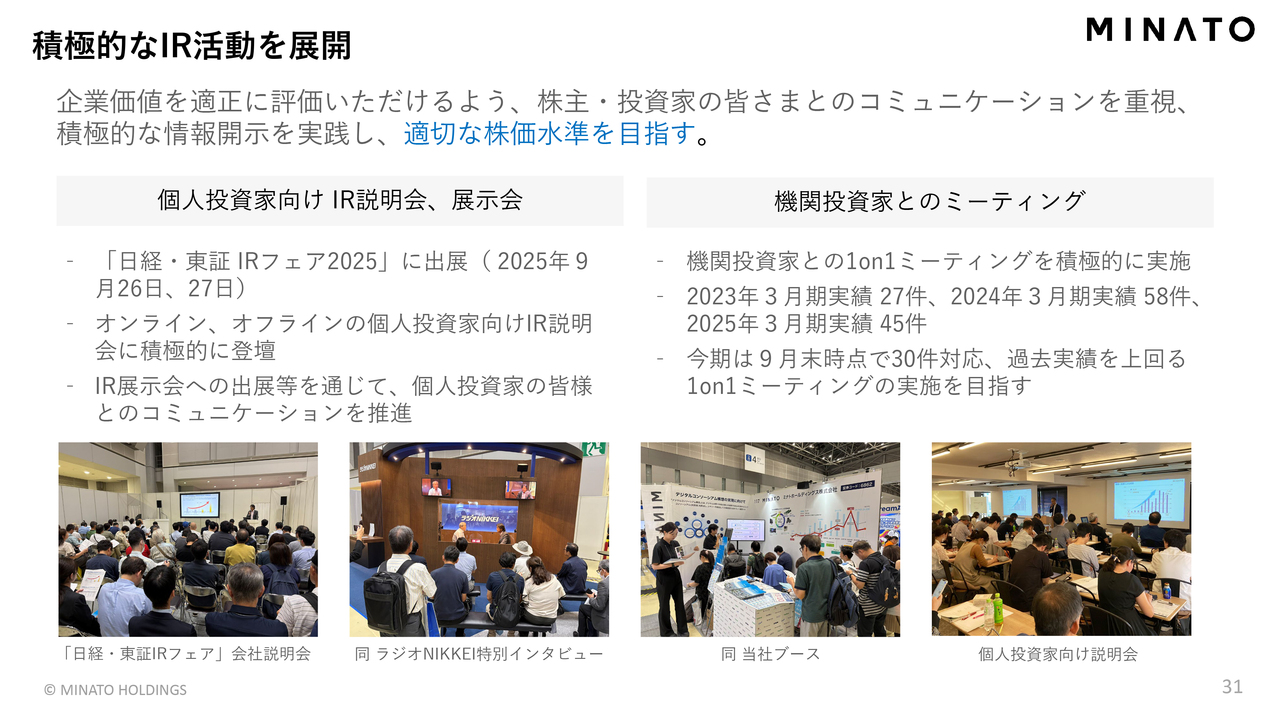 IR活動についても積極的に行っています。個人投資家向けのIR説明会については、先般開催された「日経・東証 IRフェア2025」への出展をはじめ、各地で個人投資家向けの説明会をオンラインおよびリアルで開催しています。今後も継続的に実施する予定ですので、ぜひ参加をご検討いただければと思います。