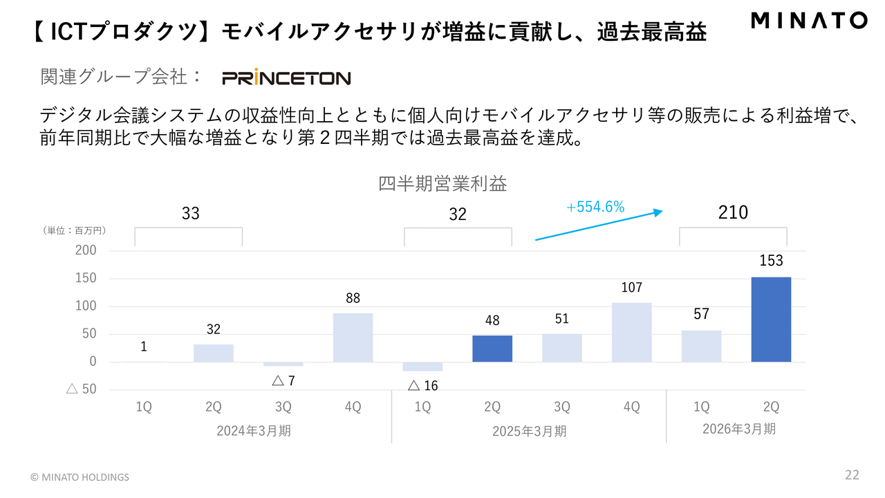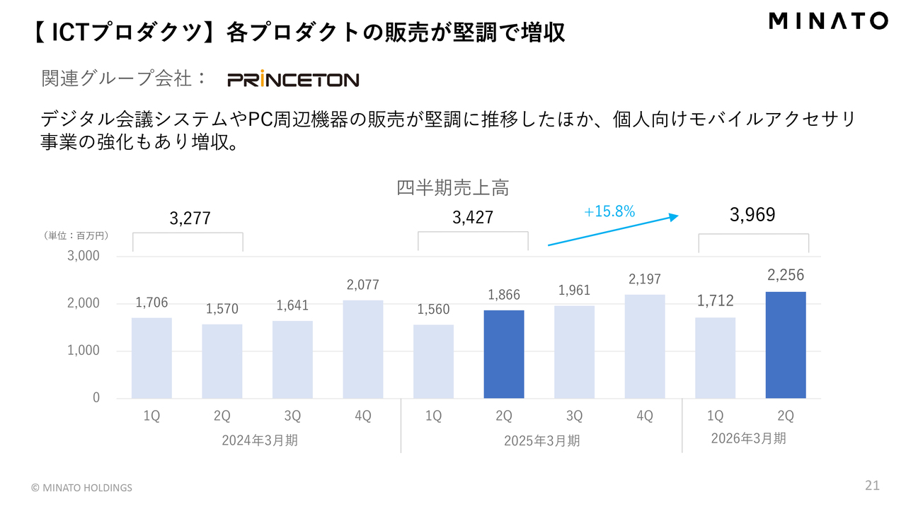 ICTプロダクツについてご説明します。こちらはプリンストンが手がけており、主にデジタル会議システムやPC周辺機器の販売が堅調に推移しました。また、モバイルバッテリーを含む個人向けモバイルアクセサリの事業強化が奏功し、売上高は前年同期比15.8パーセントの増収となっています。