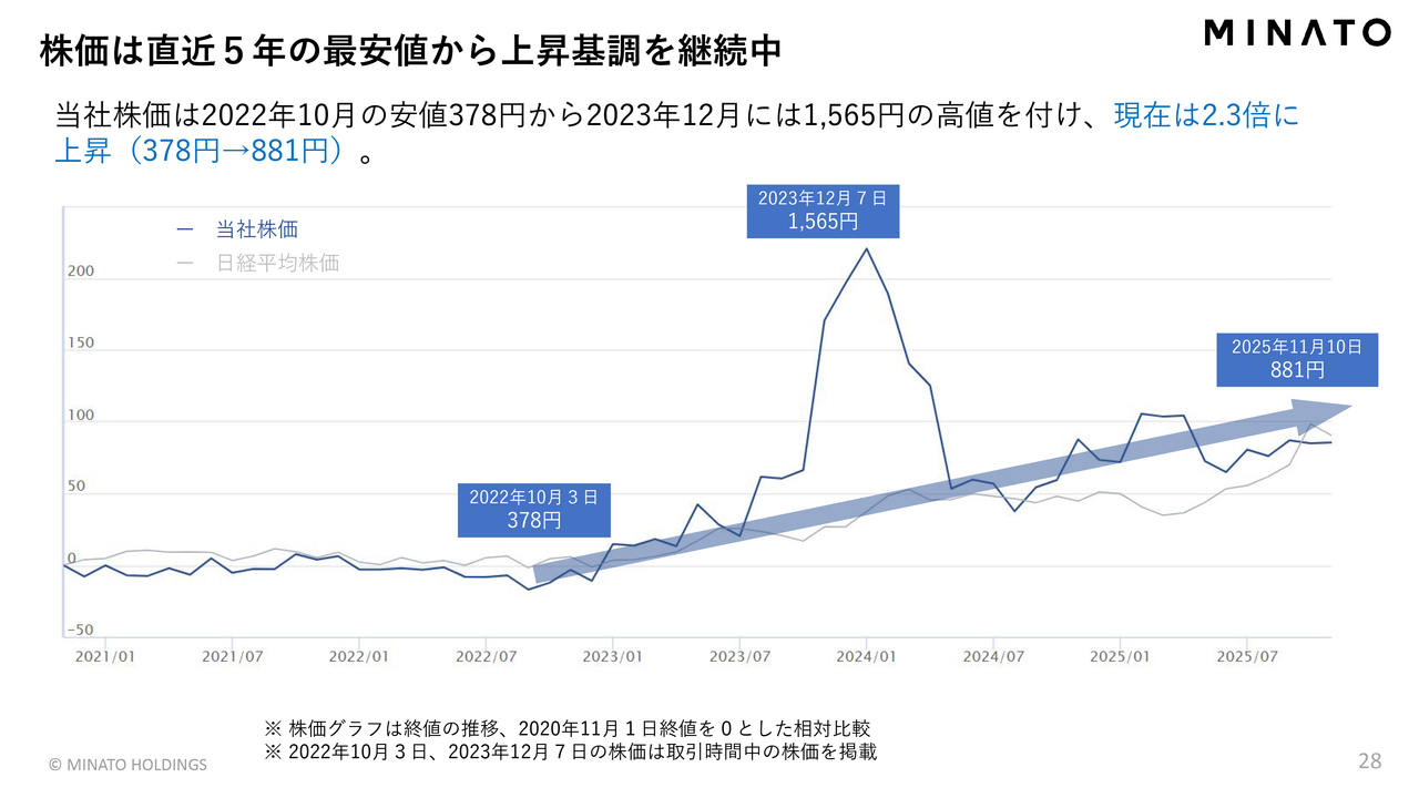 また、ミナトホールディングスは1956年12月17日に設立されました。2026年12月に設立70周年を迎えます。これも株主のみなさまやステークホルダーのみなさまのおかげであると思っています。