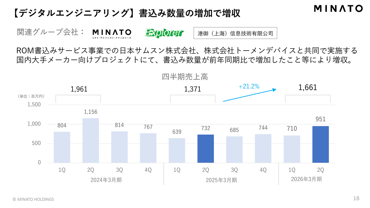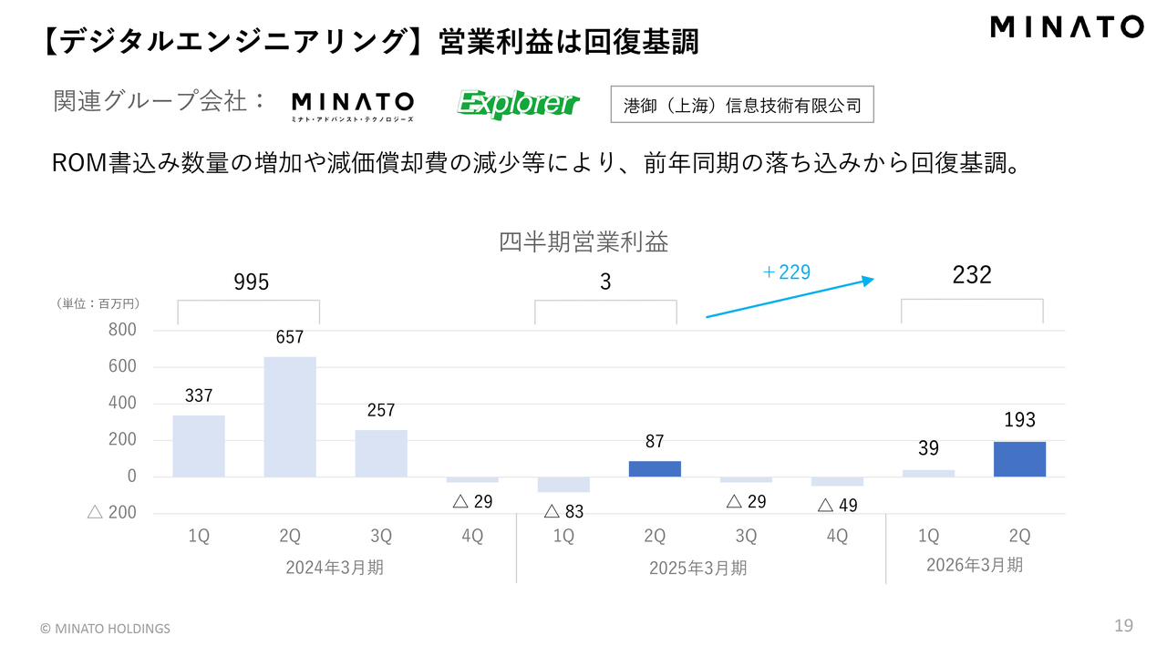 デジタルエンジニアリングの営業利益についてです。前年同期はスライドに示しているとおり非常に苦しい状況でしたが、ROM書込み数量の増加や減価償却費の減少などにより、落ち込みから回復基調に転じています。