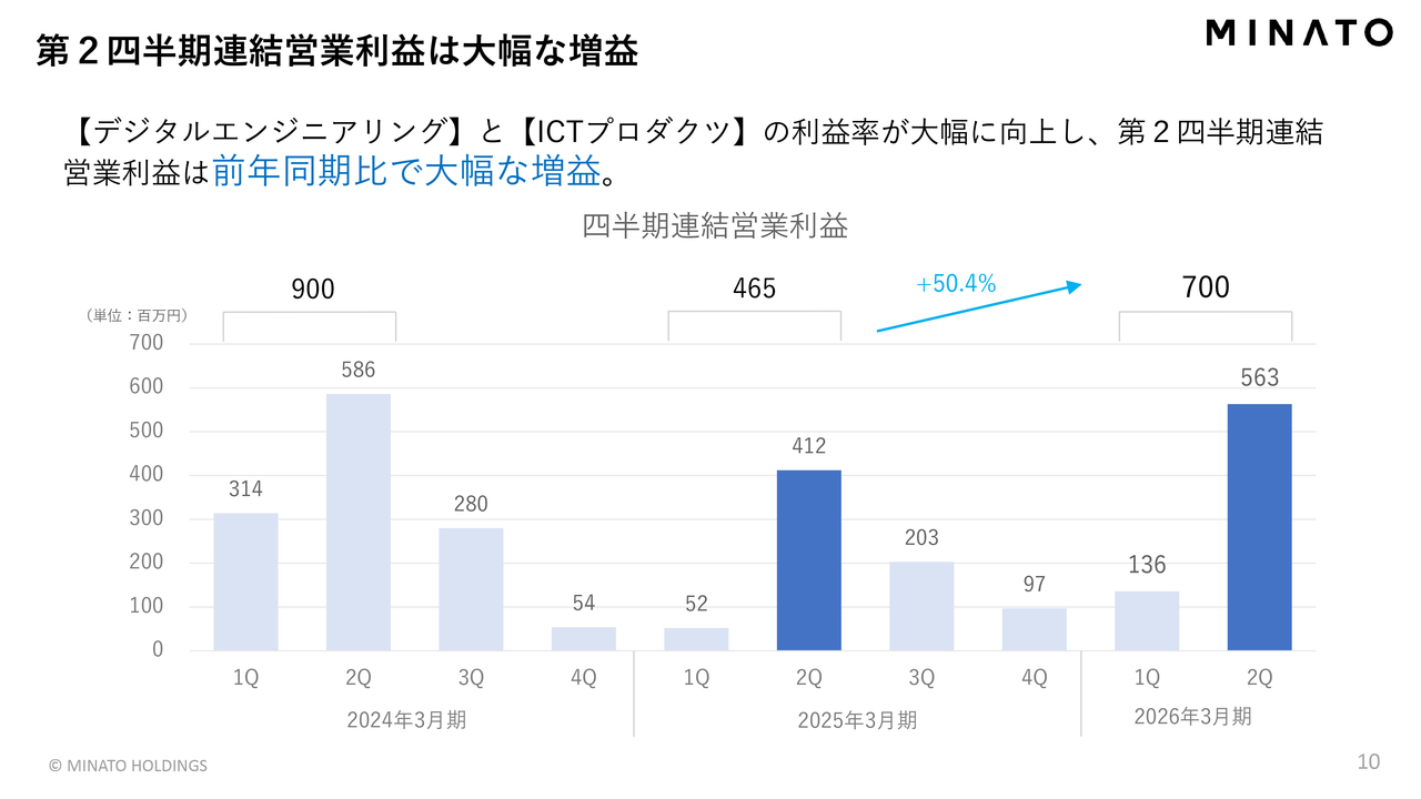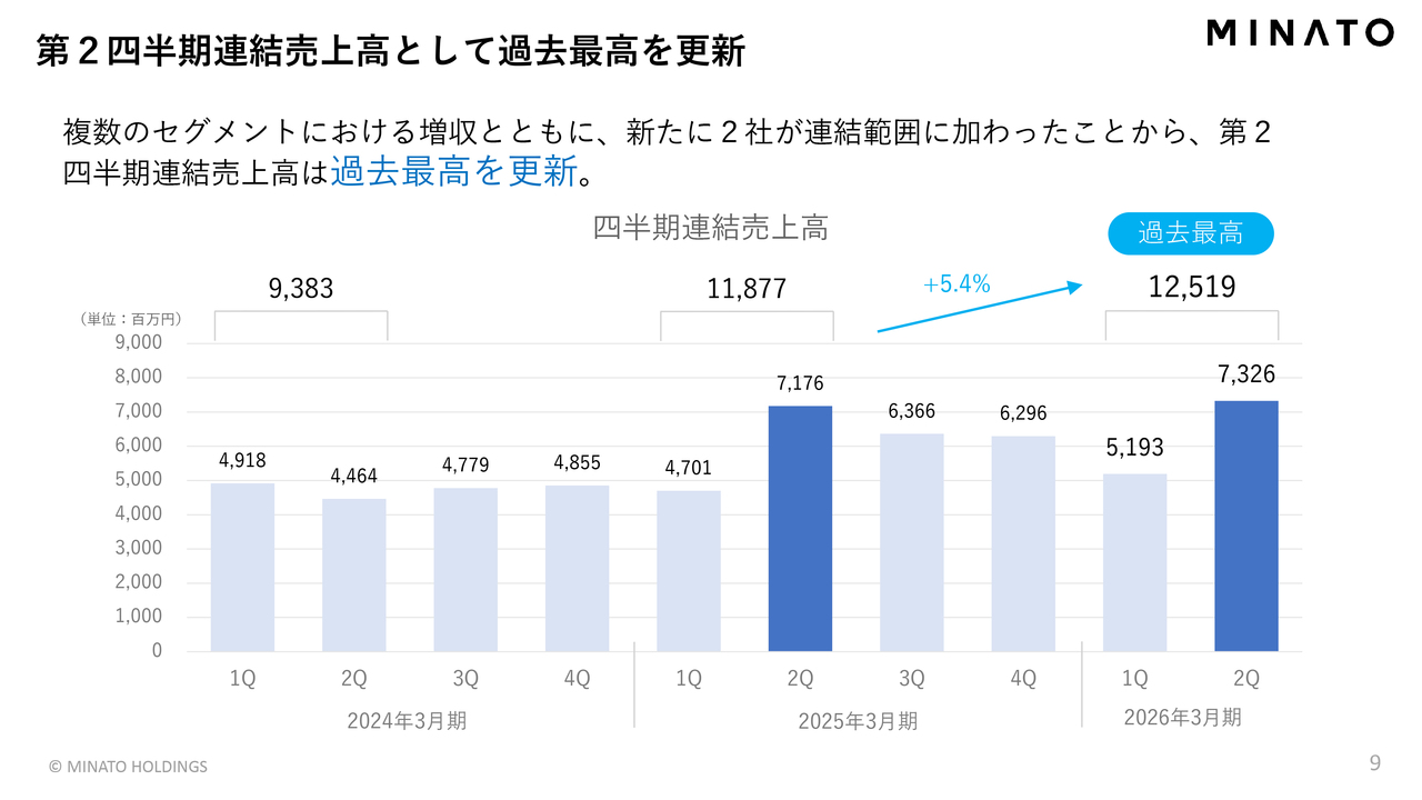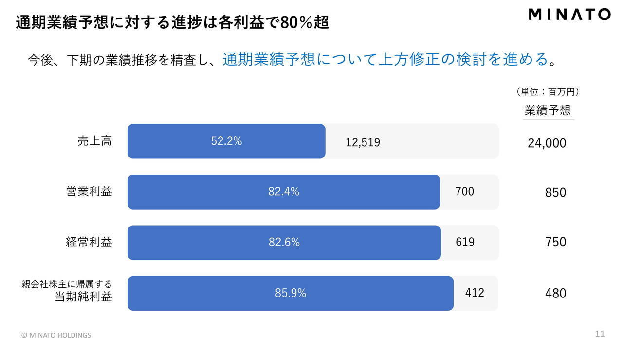 【QAあり】ミナトHD、2Q連結売上高が過去最高を更新 営業利益前年比+50.4%、各利益の通期業績予想進捗80%超