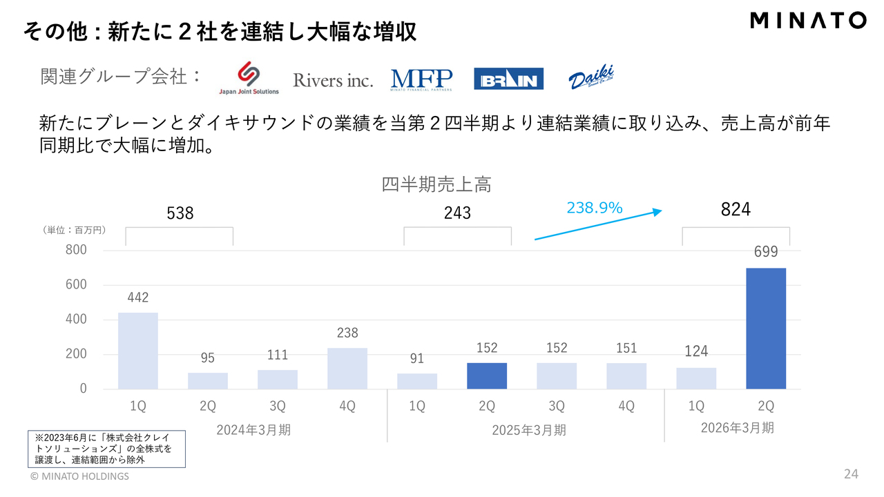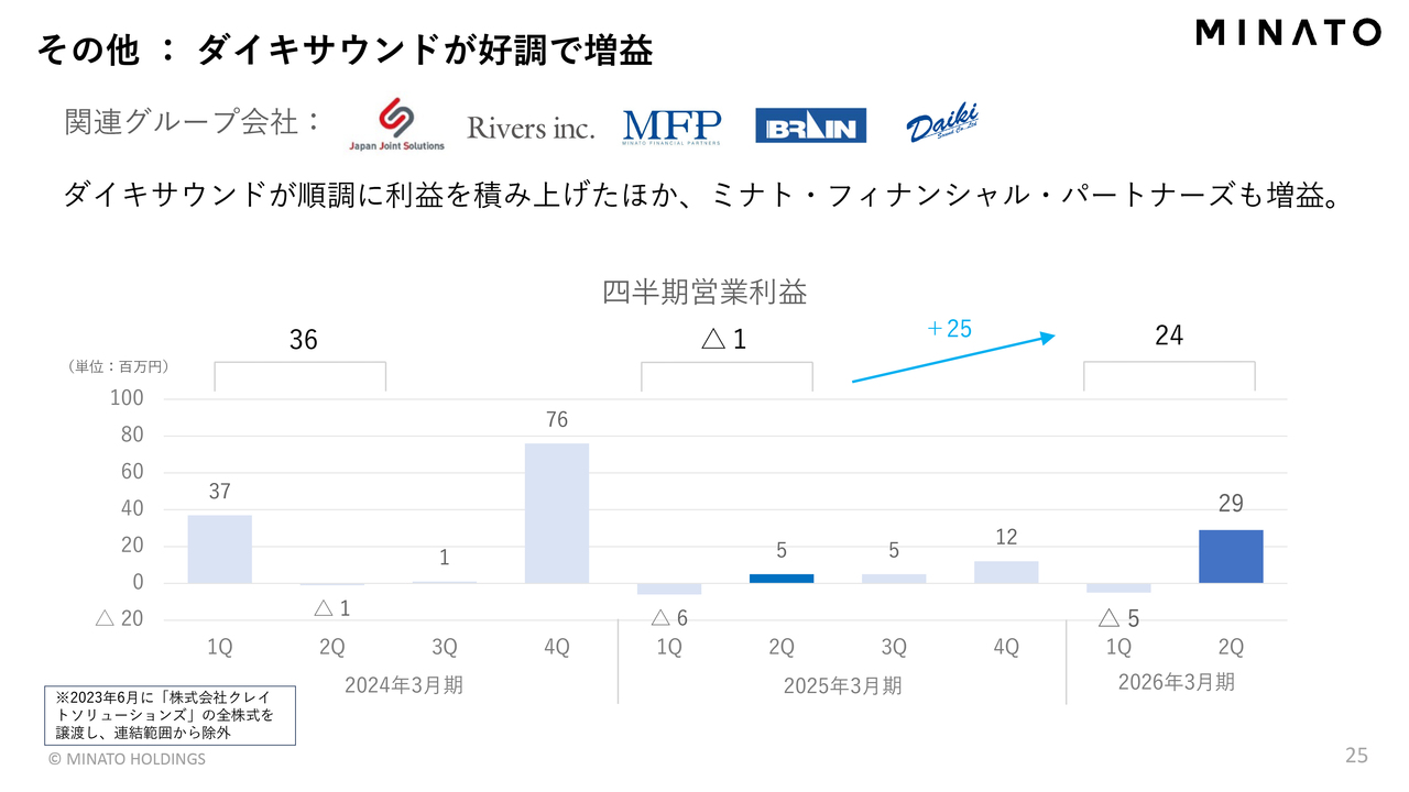 その他のビジネスにおける営業利益については、前年同期はマイナスでしたが、今年度はしっかりとプラスを計上することができました。これは、新たに取り込んだダイキサウンドが堅調に推移したことや、ミナト・フィナンシャル・パートナーズにおける各種ファイナンス関連の収益が増加したことが要因です。