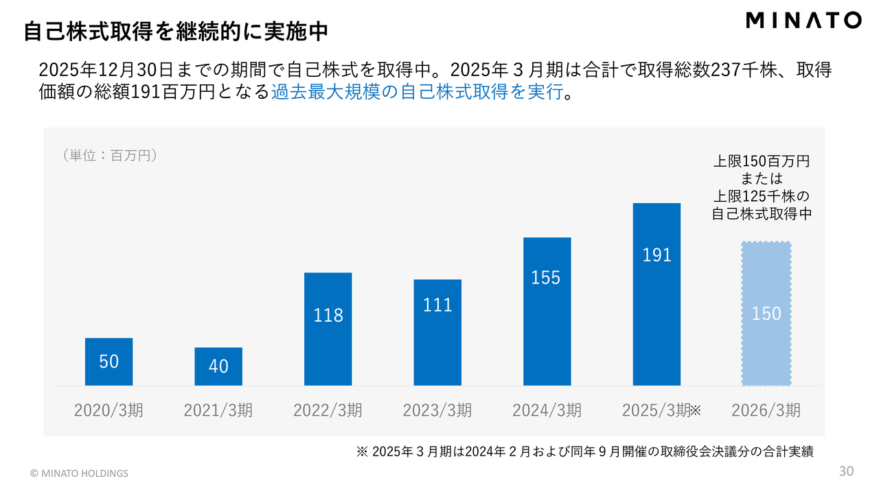 現在も取得枠を設けており、上限1億5,000万円または12万5,000株の自己株式を取得中です。10月末時点で約9万株を取得済みですので、全体の約4分の3を取得したことになります。今後も継続して実施していく予定です。