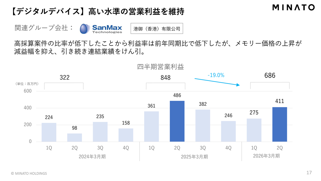 一方で、メモリー価格の上昇分に係るビジネスの利益もあり、これによって減益幅は抑えられました。その結果、引き続き連結業績をけん引するかたちとなっています。