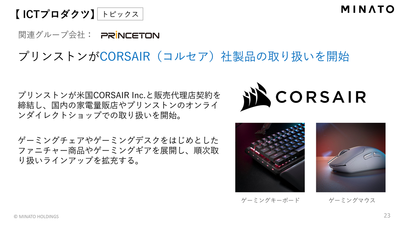 ICTプロダクツのトピックスとして、プリンストンが米国のCORSAIR社製品の取り扱いを開始しました。ゲーミングキーボード、ゲーミングマウス、さらにはゲーミングチェアなどの家具も取り扱っています。今後も新しいお客さまに楽しんでいただける製品を紹介していきたいと考えています。