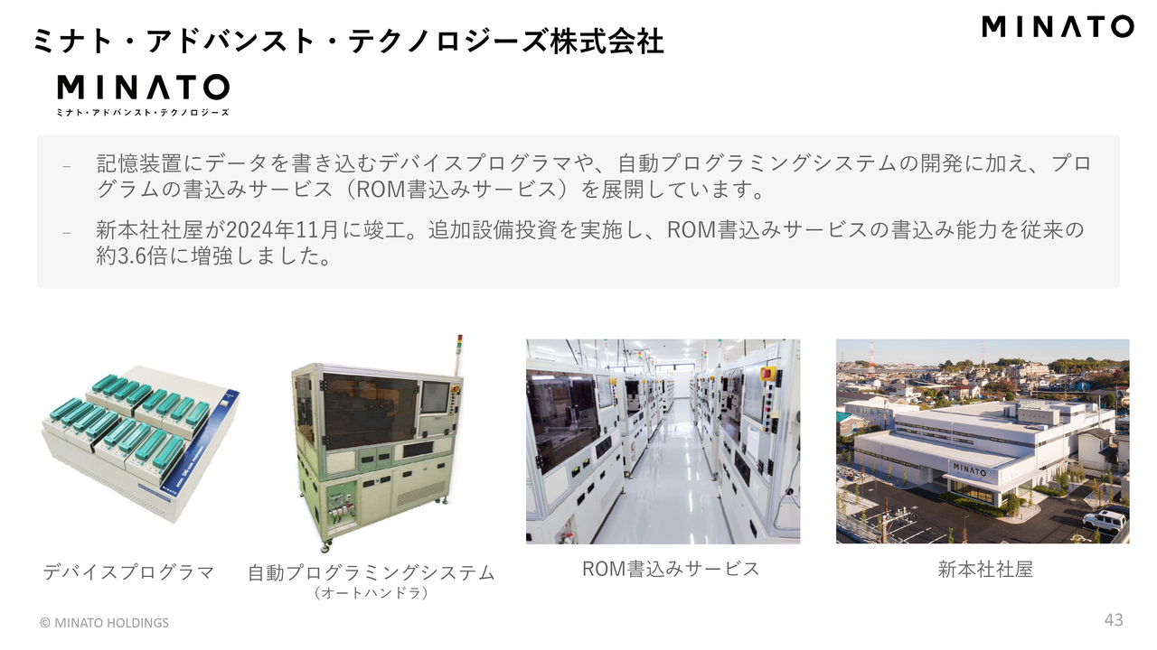 役割分担としては、日本サムスンがデバイスを開発・製造し、トーメンデバイスが流通部分を担当しています。そして、ミナト・アドバンスト・テクノロジーズがデバイスにプログラムを書き込む作業を行っています。当社は設備を保有しており、2024年11月には新社屋を竣工させ、その中にROM書込みに必要な設備をすべて整えています。