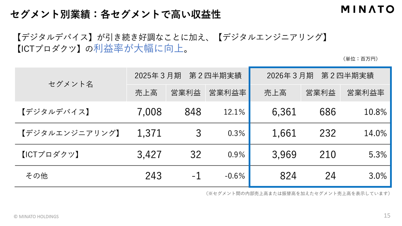 セグメント別にもう少し詳しくご説明します。まず、全体のまとめです。デジタルデバイスが引き続き高水準で好調を維持していることに加え、デジタルエンジニアリングとICTプロダクツも増収増益となりました。これらにより、利益率が大幅に向上しています。