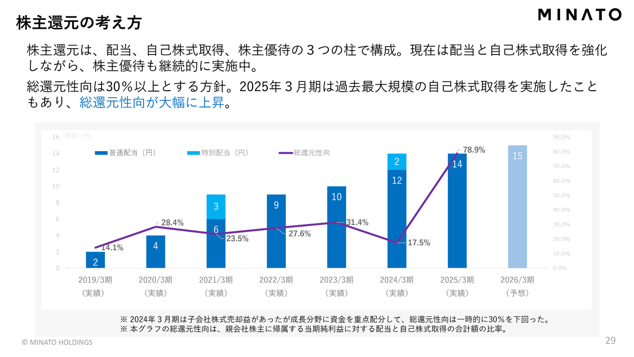 配当については、スライドに記載のとおり、2019年3月期に復配を開始して以来、継続的に増配を行ってきました。2026年3月期は15円の配当を予想しており、さらに自己株式の取得も行うことで、株主還元を図っていきたいと考えています。