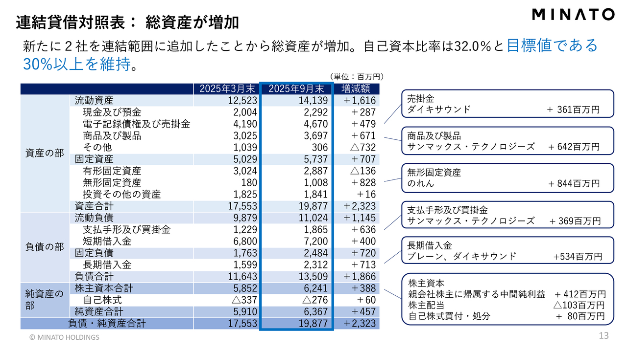 連結貸借対照表です。新たにブレーンおよびダイキサウンドの2社を連結範囲に追加したため、全体として総資産が増加しました。