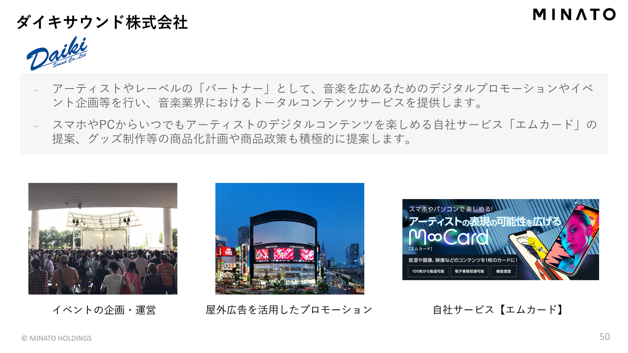 3つ目は、ビジネスの面では外部のみなさまにはシナジーが見えづらいかもしれませんが、実際にはダイキサウンドやブレーンがさまざまなプロモーション活動を行っています。特に、デジタル機器を活用したプロモーション活動やWebサイトの制作など、当社グループがこれまで培ってきたプロモーション支援を活かしてサポートしています。