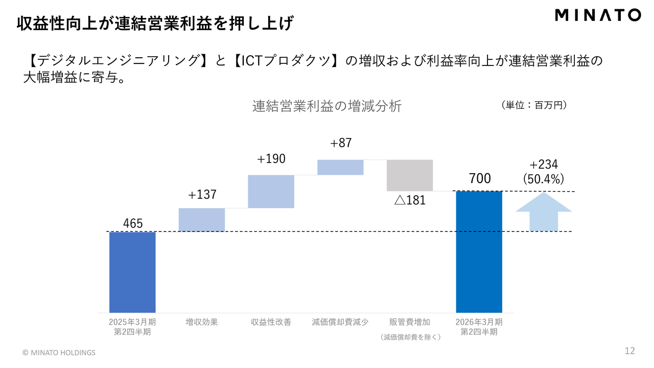 連結営業利益の増減分析についてご説明します。スライドに示しているとおり、デジタルエンジニアリングとICTプロダクツの増収効果、および各セグメントにおける利益率の向上が、連結営業利益の大幅な増益に寄与しています。