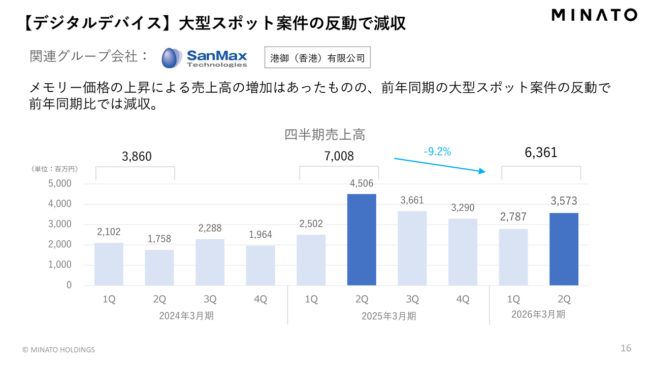 メモリー価格の上昇により、売上高の増加がありました。一方で、昨年、2025年3月期第2四半期に大型のスポット案件がありましたが、今期はその分がなくなったことから、反動により減収となっています。