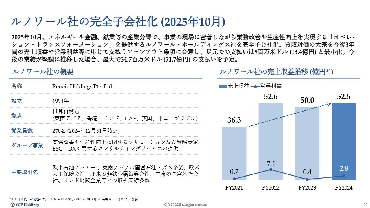 業績については、売上高が50億円程度であり、収益性にはばらつきが見られるのが現状です。これまで当社は、ルノワール社の創業者兼CEOのKrishna Paupamah氏というイギリス人と、このM&Aについて交渉を進めてきました。