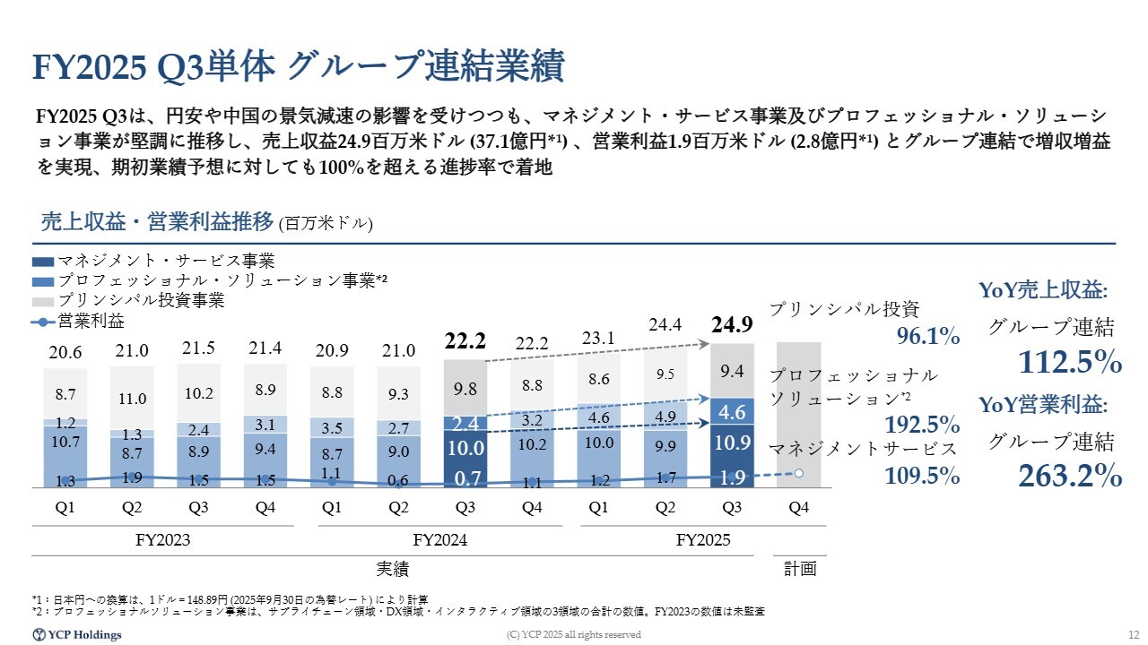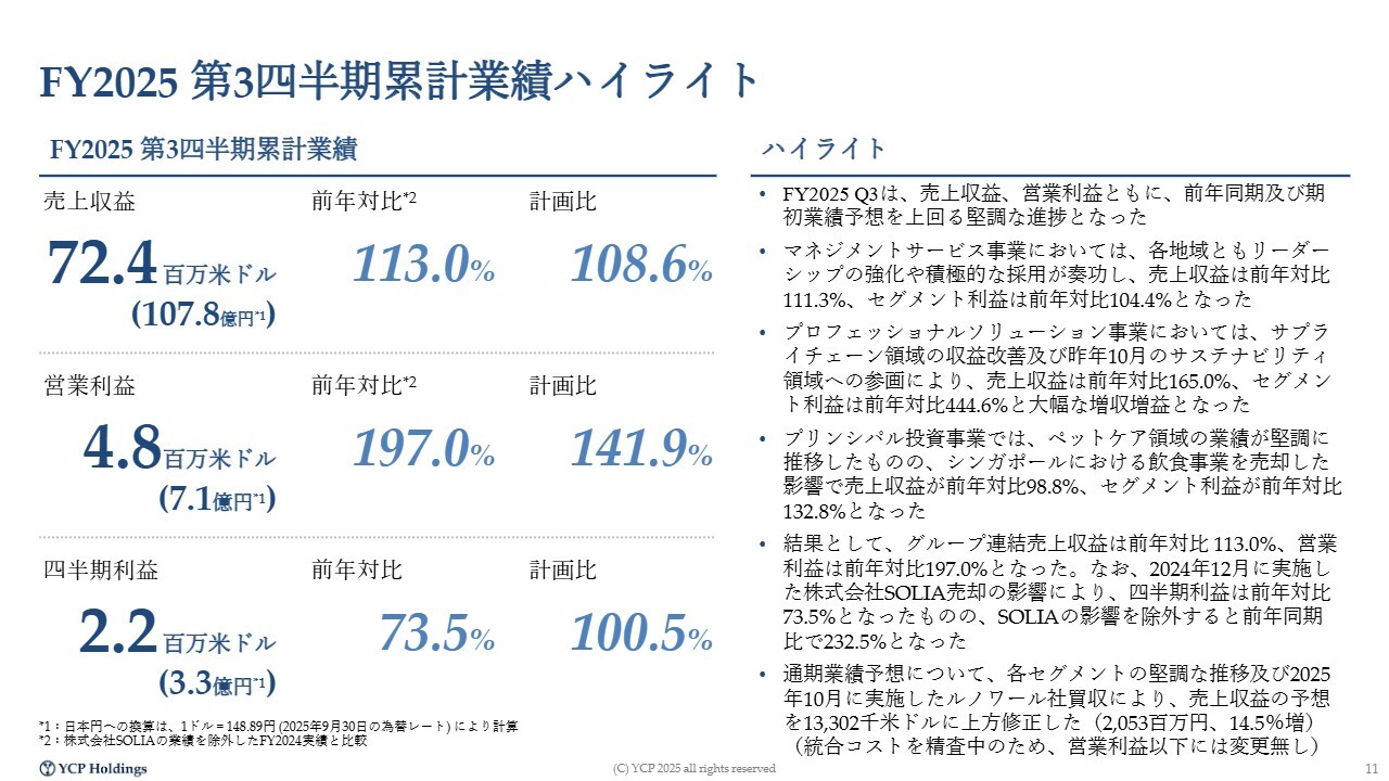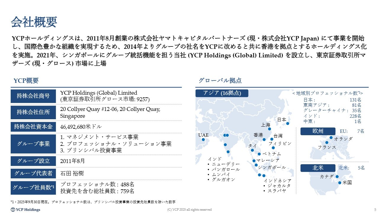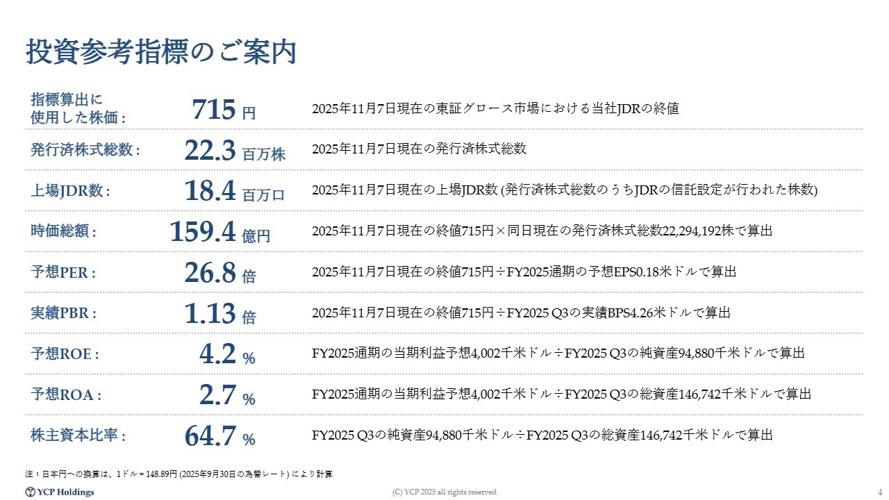 石田裕樹氏(以下、石田):2025年12月期第3四半期決算説明会を始めます。YCPホールディングス(グローバル)リミテッドでグループCEOを務めています石田裕樹と申します。本日は、どうぞよろしくお願いします。