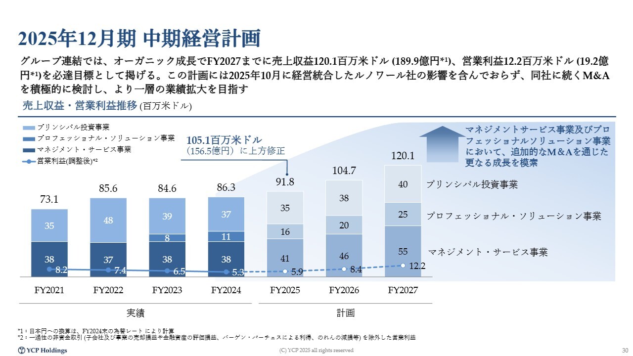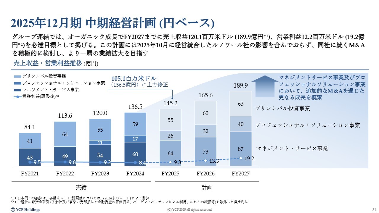 マネジメント・サービス事業については、87億円としていますが、いち早く100億円を達成するための計画をお伝えしました。一方、プロフェッショナル・ソリューション事業は40億円と記載していますが、すでに50億円規模のルノワール社が加わることで、合計90億円規模の事業にできる見込みです。