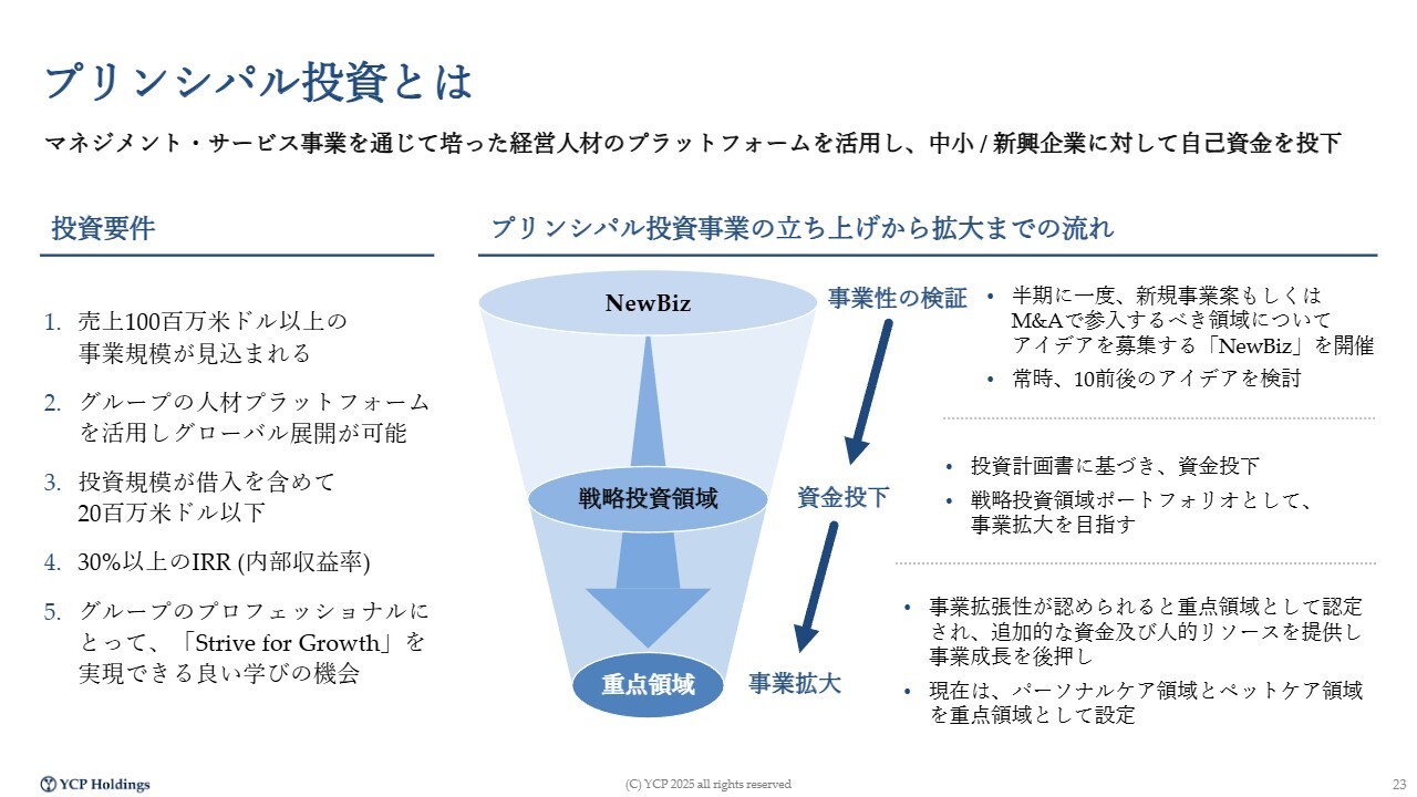 プリンシパル投資事業については、すでに2社を売却しています。新たな投資にも取り組んでいますが、一定の規模に達したものは売却して更新する方針であるため、売却が進むと減少する仕組みになっています。
