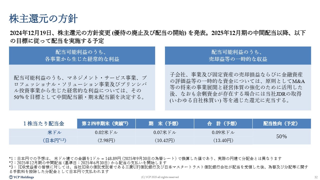 昨年末に株主還元の方針についてご説明しました。中間配当は6月末時点の株主のみなさまに対して実施しました。期末配当についても、スライドで示しているような水準を想定しており、12月末時点の株主のみなさまに還元できるよう努めていきたいと考えています。