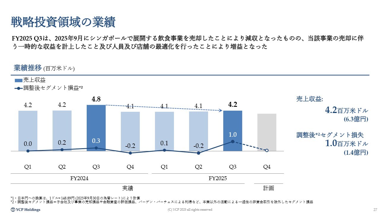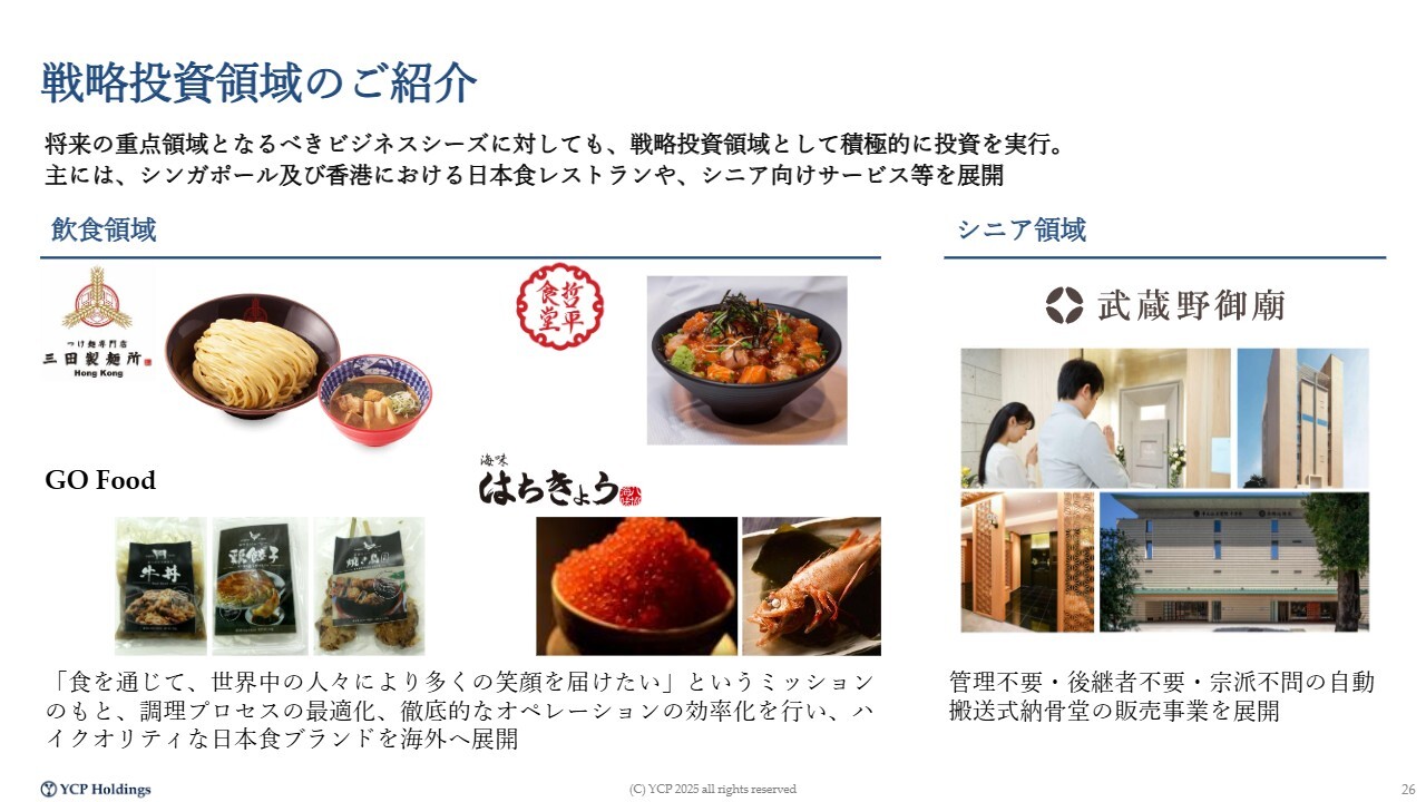 戦略投資領域についてです。後ほど詳しくご説明しますが、シンガポールで展開していた「哲平食堂」という海鮮丼のチェーンと「GO Food」というセントラルキッチンの事業、この2つは9月に売却し、投資資金を回収することができました。
