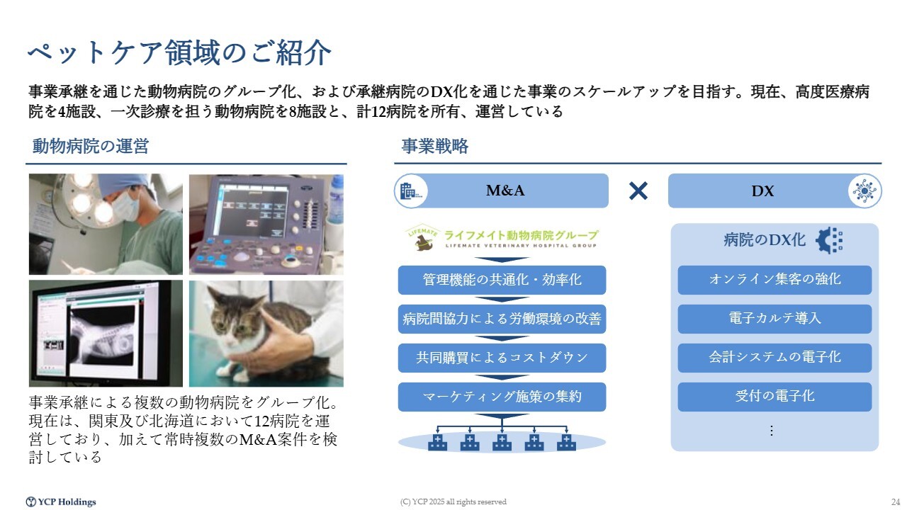 プリンシパル投資事業は、ペットケア領域とそれ以外に分類されています。かつては株式会社SOLIAがパーソナルケア領域の別セグメントとして存在していましたが、同社の売却後はペットケア領域とそれ以外で整理しています。ペットケア領域においては、直近で2病院を追加でM&Aし、現在12病院を所有し、運営しています。