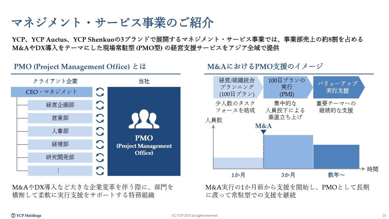 例えば、M&Aの取り組みについてですが、スライドに記載しているとおり、M&Aの決裁のおよそ数ヶ月前から準備期間として支援を開始します。M&A決裁後に何をしなければならないのかという課題を洗い出し、それを約3ヶ月間、いわゆる「100日プラン」として集中的に取り組んでいきます。この期間に新しい会社との統合に向けた必要な事項を徹底的に実行します。