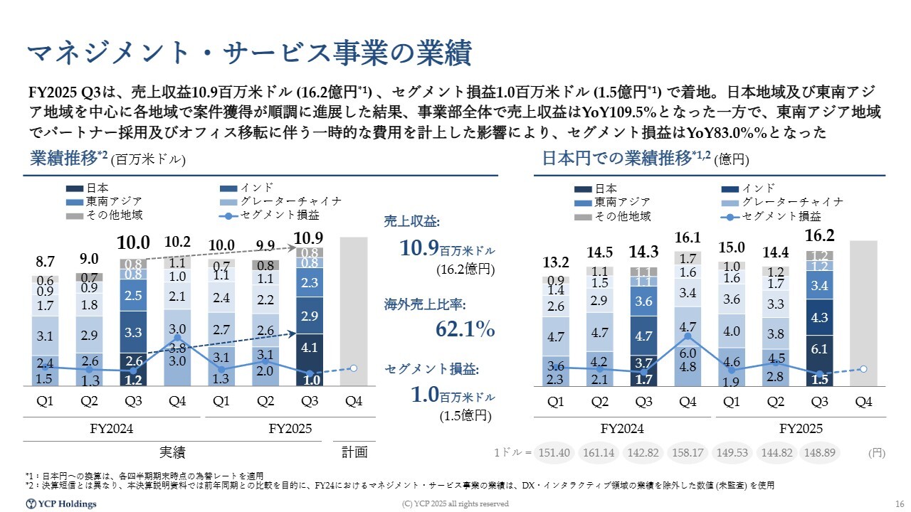 以上がマネジメント・サービス事業の説明です。最後に補足すると、私たちはシンガポールに本社を構え、グローバルサウスを意識した経営を推進してきた結果、日本での売上が400万米ドルに達しました。一方で、東南アジアとインドを合わせた売上はすでに5,200万米ドルとなっています。