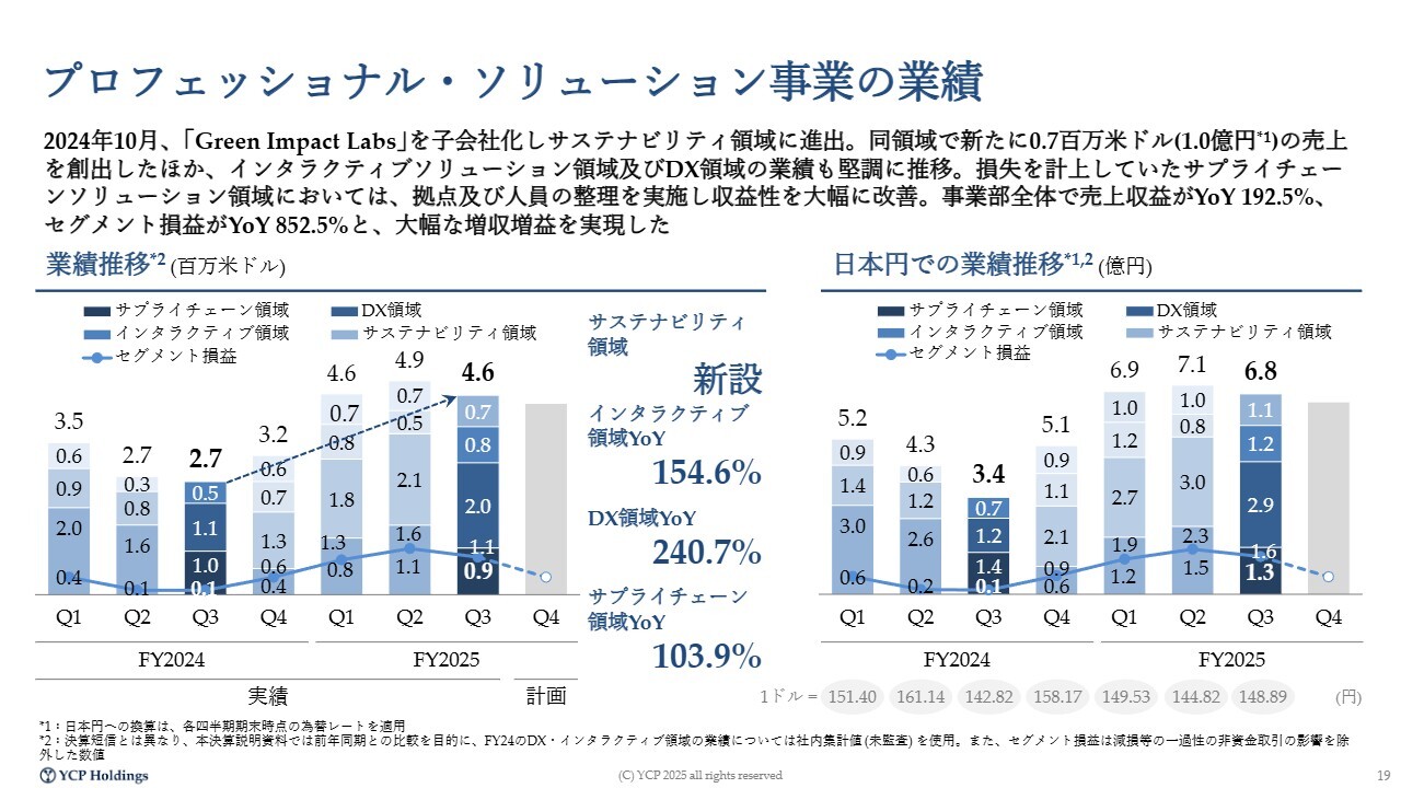 また、サステナビリティ領域への進出や、インタラクティブ領域での50パーセントの成長、デジタル領域では100パーセント日本での取引による2.4倍の売上拡大、さらにサプライチェーンにおいては売上に変動はないものの収益性を大幅に改善することができたということがプロフェッショナル・ソリューション事業全体の状況です。第4四半期の計画値も図示していますが、おそらくここを大きく上回る結果を達成できると考えています。