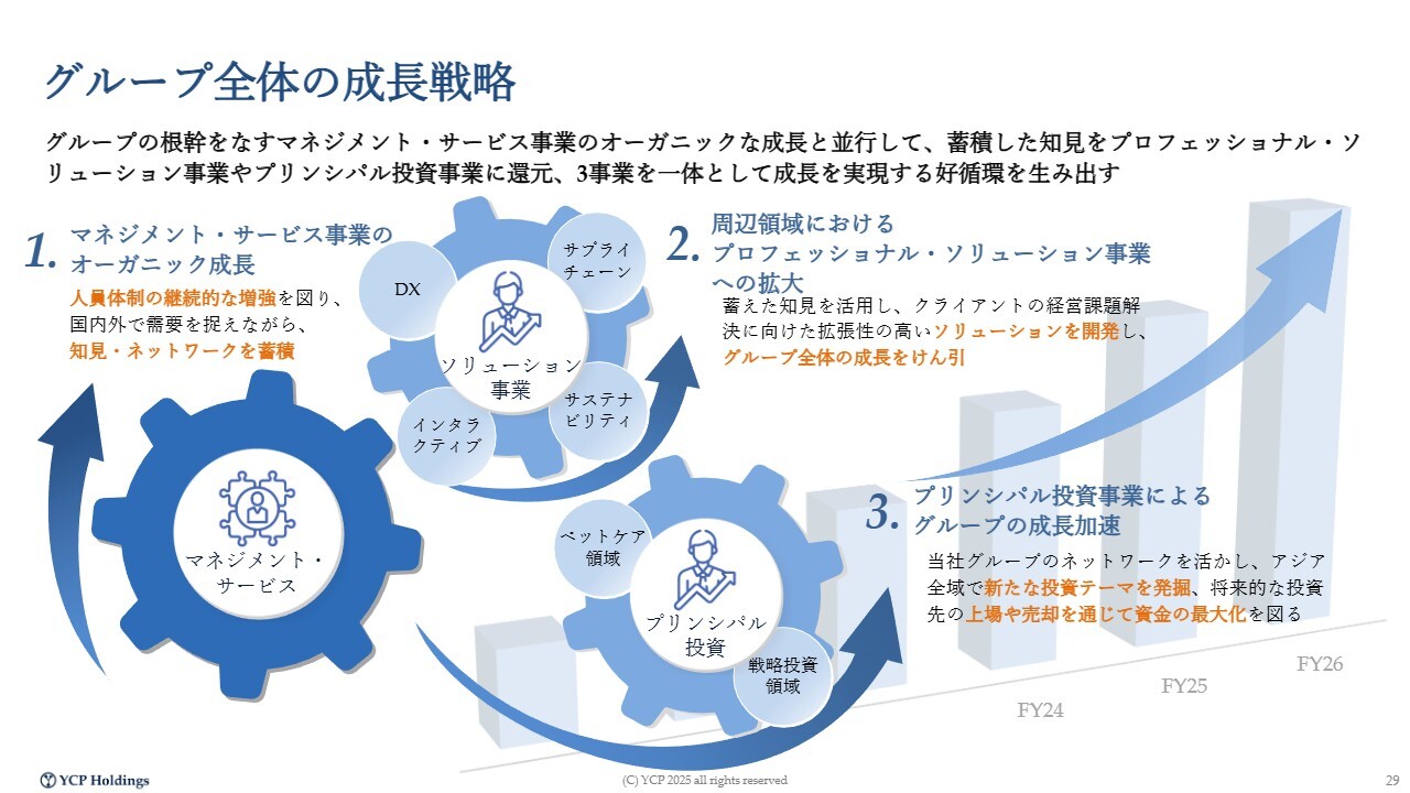 投資をして時間が経過した後、適切なタイミングでポートフォリオの投資先を適切なかたちで外部に売却し、そこで回収した資金をグループ、特にコンサルティングサービスやプロフェッショナルサービスの拡大に活用する戦略を掲げて、そのようなプリンシパル投資にも取り組んでいます。