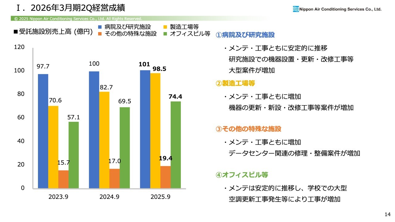 病院及び研究施設では、メンテナンスとリニューアル工事の両面で安定的に推移しており、特に大型案件が増加しています。
