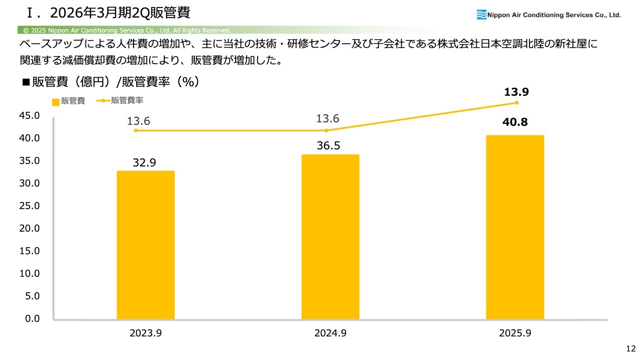 2026年3月期第2四半期の販管費についてです。ベースアップによる人件費の増加に加え、当社の技術・研修センター、子会社である株式会社日本空調北陸の新社屋、当社の九州支店の新社屋建設に伴う減価償却費等が増加しています。