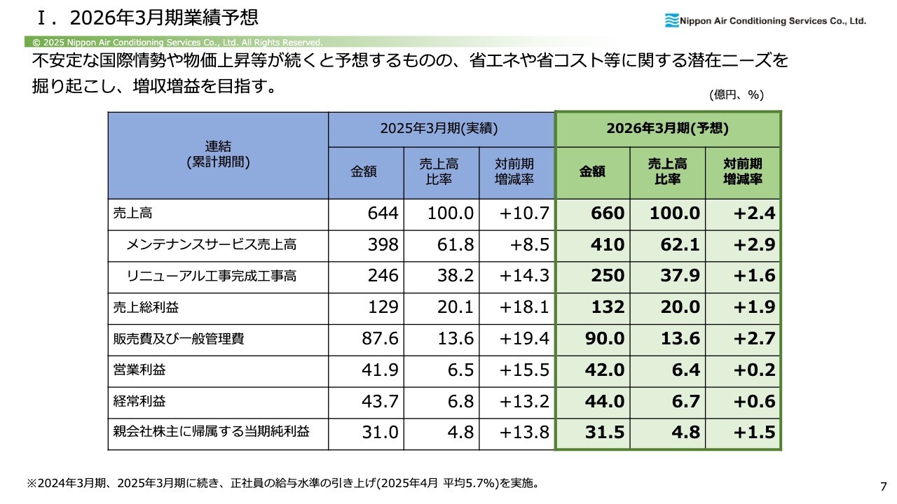 まず、2026年3月期の業績予想についてです。不安定な国際情勢や物価上昇等が続くと予想する一方で、省エネや省コスト等に関する潜在ニーズを掘り起こし、増収増益を目指す方針です。