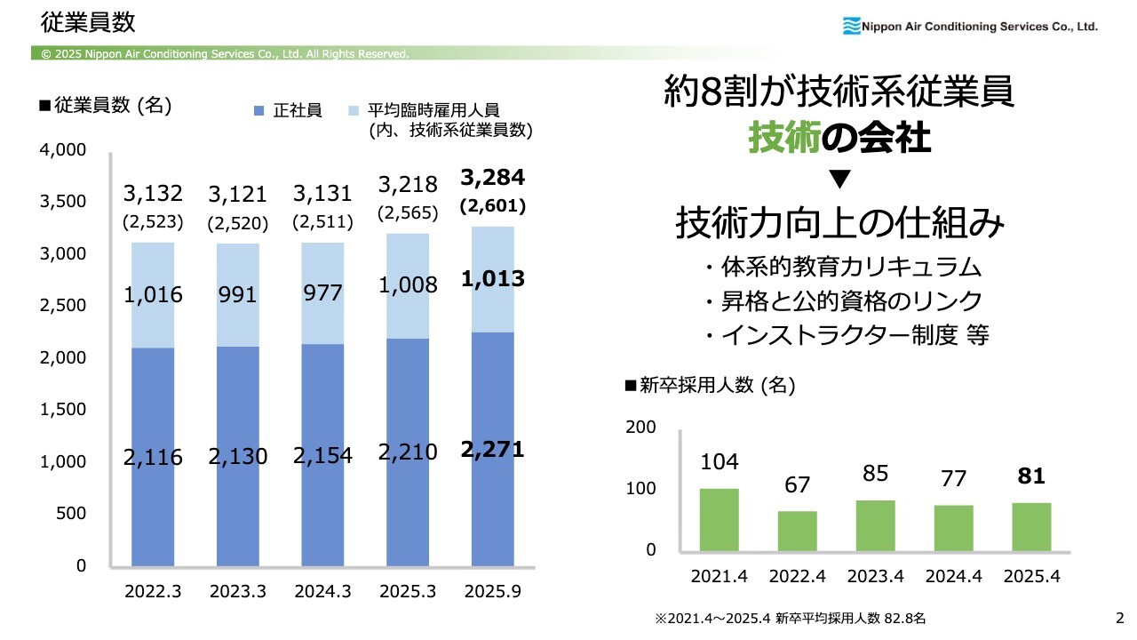 従業員数です。スライド左側のグラフは、過去4年分の従業員数の推移を示しています。2025年9月末時点で全従業員3,284名のうち、2,601名が技術系従業員です。つまり、約8割が技術系従業員であり、当社は技術の会社といえます。