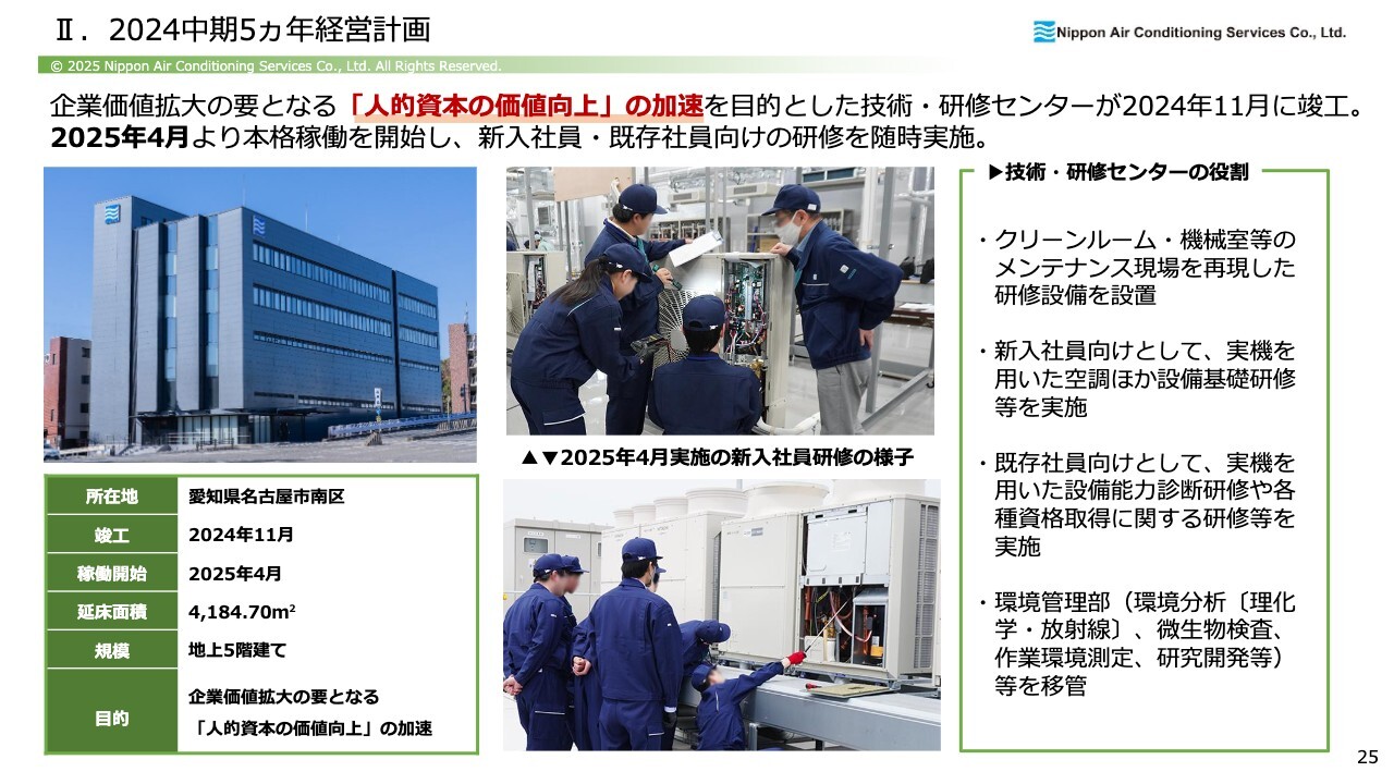 技術・研修センターについてご説明します。人的資本の価値向上の加速を目的として、2024年11月に竣工しました。本年4月より本格稼働を開始し、新入社員向けに約1ヶ月間の集合研修を実施しました。もちろん、新入社員だけでなく、中堅層・ベテラン層の社員向けにも随時研修を実施しています。