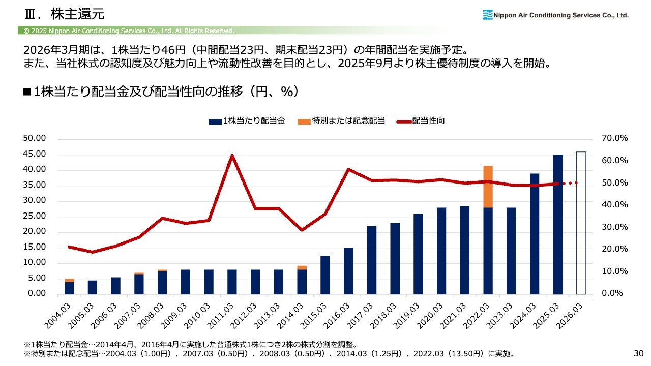 1株当たり配当金及び配当性向の推移を示したグラフです。ご覧のとおり、2005年3月期から2022年3月期まで、17期連続で累進的な配当を実施しています。2026年3月期には、1株当たり46円の年間配当を実施予定です。また、当社株式の認知度及び魅力向上、流動性改善を目的として、2025年9月より株主優待制度の導入を開始しました。