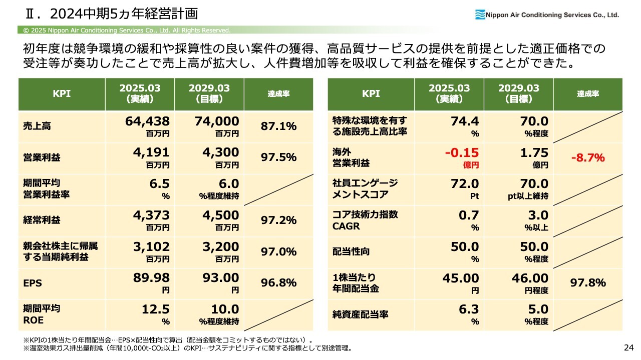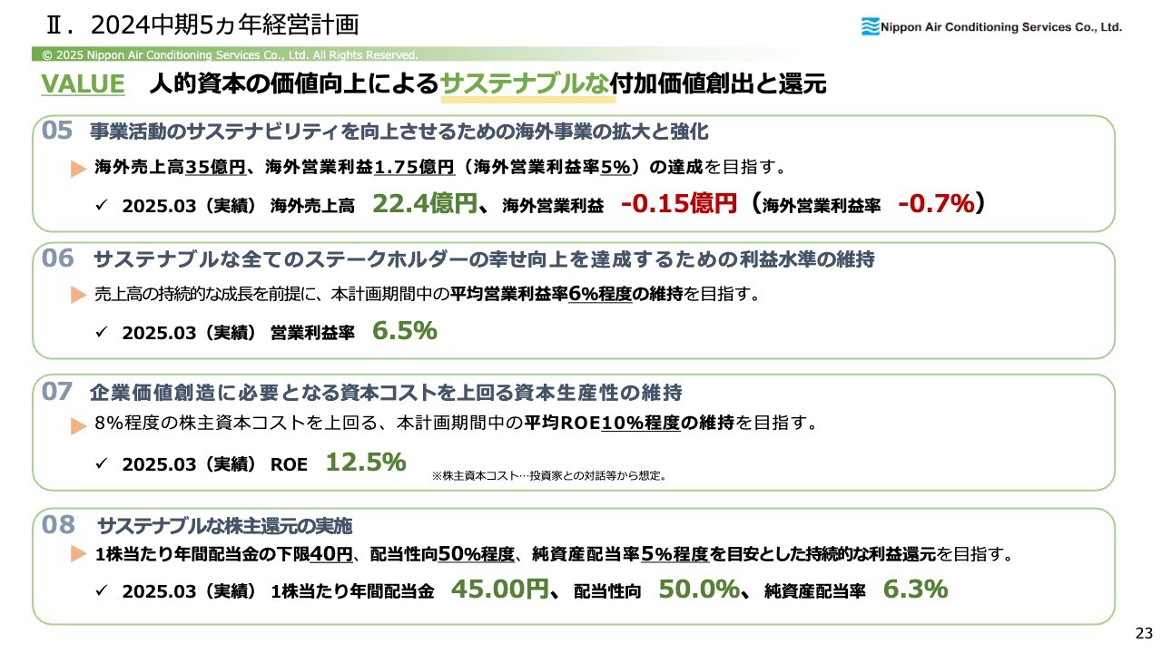 7つ目の「企業価値創造に必要となる資本コストを上回る資本生産性の維持」については、8パーセント程度の株主資本コストを上回ることを目指し、平均ROEは10パーセント程度を維持することを目標に掲げています。2025年3月期の実績は12.5パーセントであり、この点もクリアできていると考えています。
