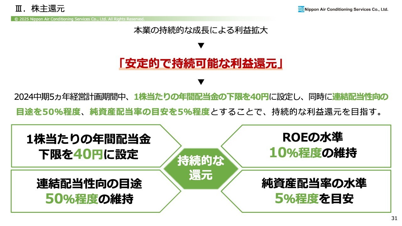 先ほどもお話ししましたが、1株当たりの年間配当金に下限を設定し、連結配当性向は50パーセントを維持します。ROEは2025年3月期の実績が12.5パーセントですが、10パーセントを確実に維持していきます。純資産配当率の水準については、5パーセント程度を目安に、維持していきたいと考えています。
