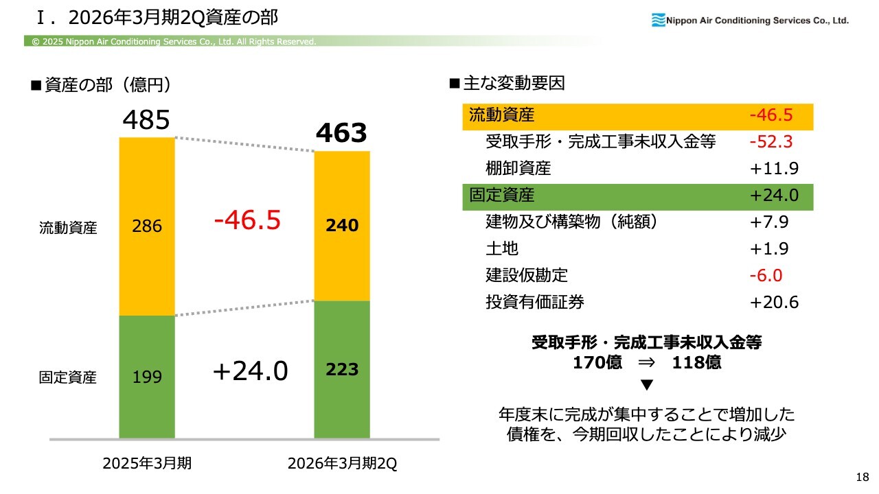 2026年3月期第2四半期の資産の部についてです。受取手形・完成工事未収入金等が170億円から118億円となりました。これは、年度末に完成が集中したことで増加した債権を今期回収したことにより、減少しました。
