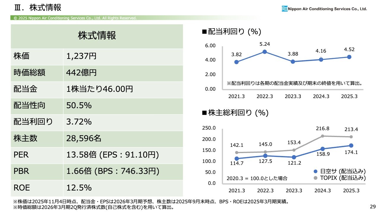 株価は1,237円、時価総額は442億円、1株当たりの年間配当金は46円、配当性向は50.5パーセントです。配当利回りは3.72パーセント、株主数は2万8,596名、PERは13.58倍、EPSは91.1円、PBRは1.66倍、BPSは746.33円、ROEは12.5パーセントとなっています。