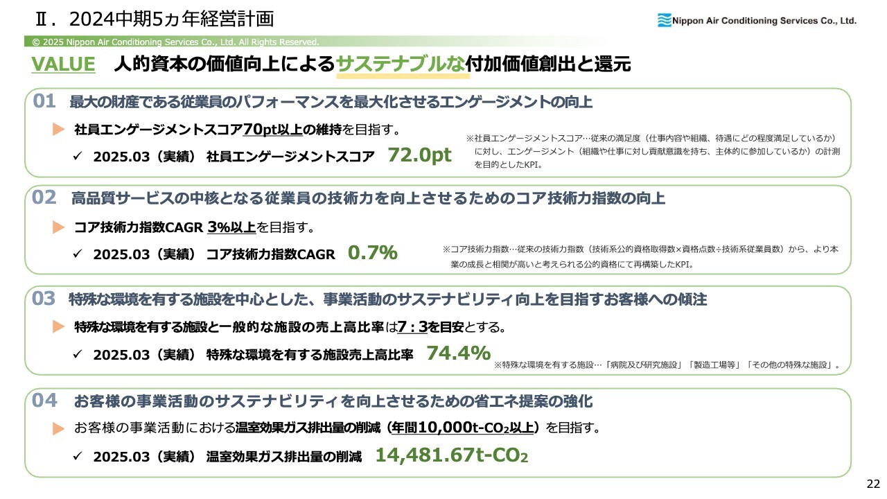 2つ目は「高品質サービスの中核となる従業員の技術力を向上させるためのコア技術力指数の向上」です。本業の成長との相関性がより高い公的資格が判明したため、このコア技術力指数をKPIとして設定しています。しかしながら、2025年3月期のコア技術力指数の年平均成長率(以下、CAGR)は0.7パーセントにとどまり、目標を達成できていません。この点については、今後さらなる注力が必要と考えています。