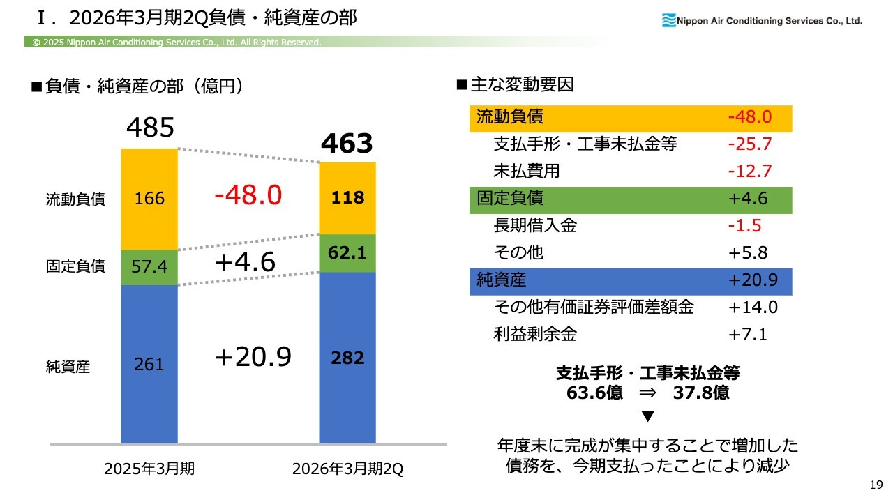 2026年3月期第2四半期の負債・純資産の部についてです。支払手形・工事未払金等は63億6,000万円から37億8,000万円となりました。これは、年度末に完成が集中することで増加した債務を今期支払ったことにより減少したためです。
