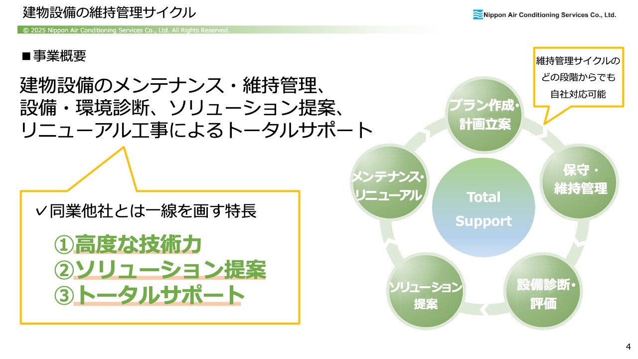 事業概要です。当社は、建物設備のメンテナンス・維持管理、設備・環境診断、ソリューション提案、リニューアル工事によるトータルサポートを提供しています。