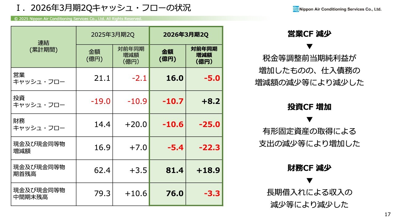 投資キャッシュ・フローは、有形固定資産の取得による支出の減少等により増加しました。2025年3月期第2四半期は技術・研修センター等の有形固定資産取得による支出がありました。