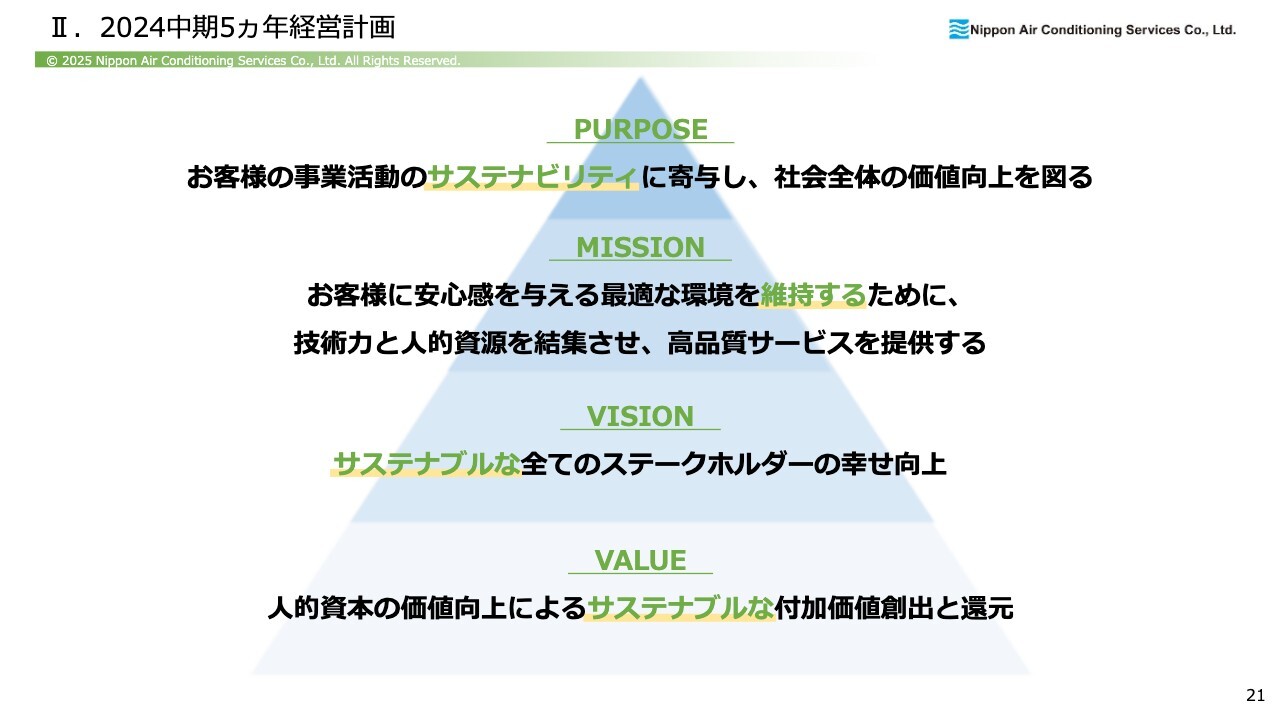 現中計について、まず、PURPOSE・MISSION・VISION・VALUEの部分を簡単にご説明します。