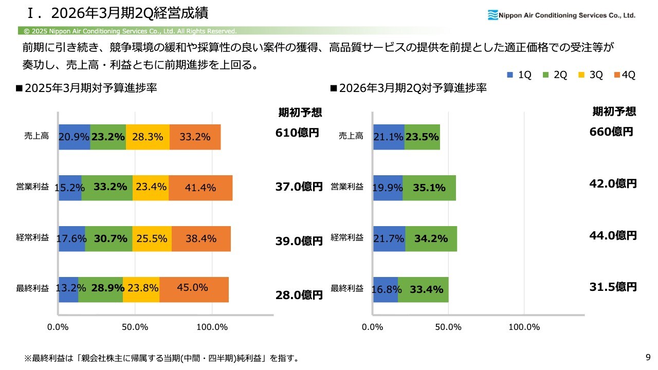 2026年3月期第2四半期は、前期に引き続き競争環境が緩和され、設備投資も予想以上に活発でした。その結果、採算性の良い案件をしっかりと獲得できました。また、適正価格での受注が奏功し、売上高・利益ともに前期の進捗を上回っています。