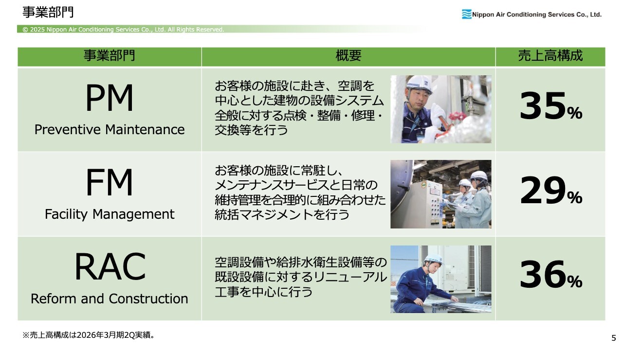依藤敏明氏(以下、依藤):日本空調サービス株式会社代表取締役社長の依藤です。よろしくお願いします。2026年3月期第2四半期の決算説明会を行います。まず、会社概要を簡単にご説明し、その後、数字の説明に移ります。
