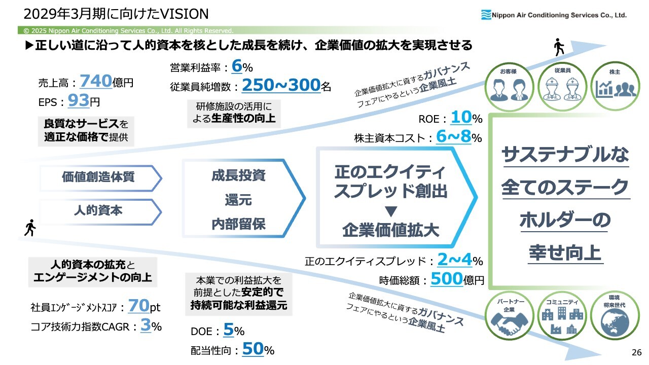 2029年3月期に向けたVISIONです。スライドの左下に「人的資本の拡充とエンゲージメントの向上」と記載しています。技術力で勝負する当社は、自社の成長に向けて社員のエンゲージメントスコア向上に注力しています。