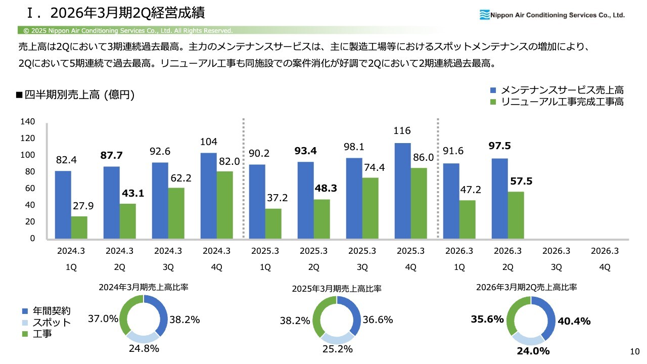円グラフは年間契約、スポット、リニューアル工事の売上高比率を示しています。2026年3月期第2四半期の内訳は、年間契約が40.4パーセント、スポットが24.0パーセント、リニューアル工事が35.6パーセントです。この比率は景気や経済状況によって若干変動しますが、概ねこのような構成となっています。